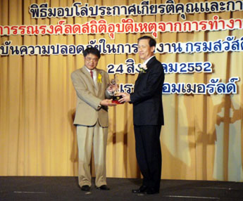 His exellency Apai Chantanajulak Minister of Labour Ministry presents to Lotushall Mining Heavy Engineering Construction Co., Ltd. a Zero-Accident Award ( During May 31th 2001 - May 29th 2009 ) compliance with the Labour Ministry's Zero - Accident Campaign.